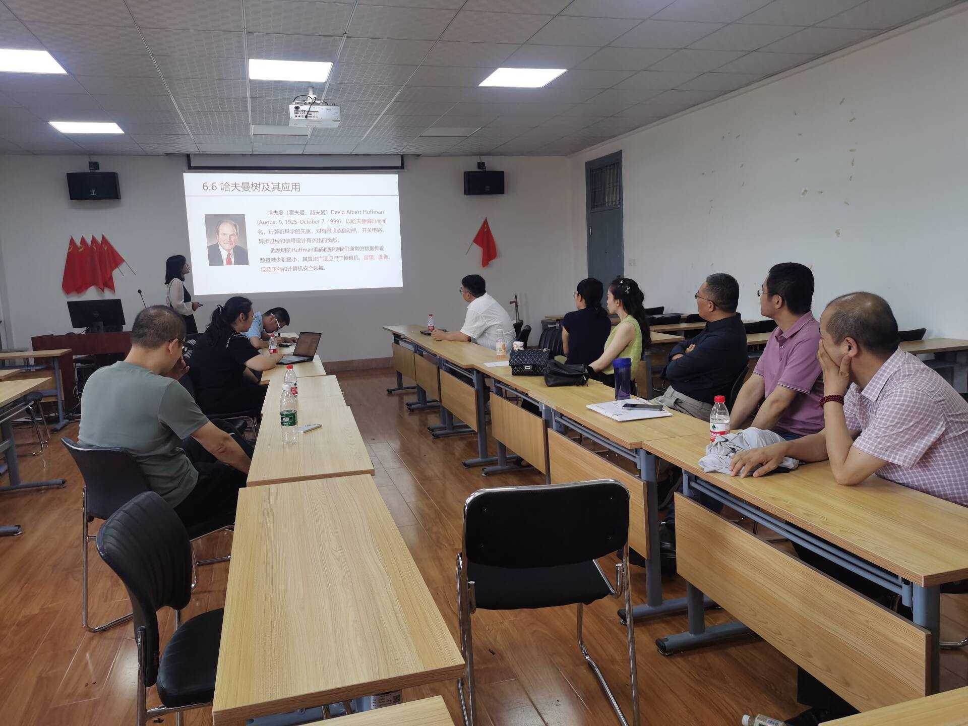 在汇报活动中,三位近5年入职的青年教师丛旭亚、尹慧平和张文超,分别选择形式语言与自动机的带空移动的不确定自动机与确定的自动机转化的章节、数据结构与算法的哈夫曼树的构造章节和深度学习课程的反向传播算法章节,进行生动的讲解,各位青年教师纷纷展示他们在教学过程中的创新方法和独特见解