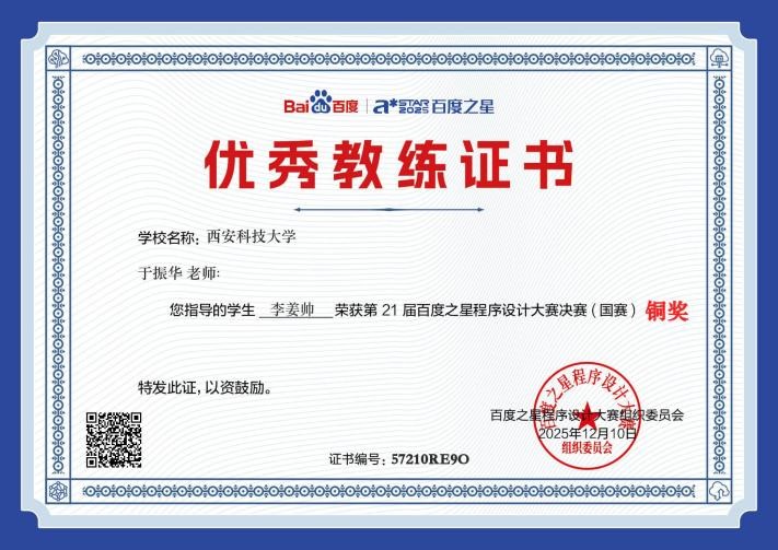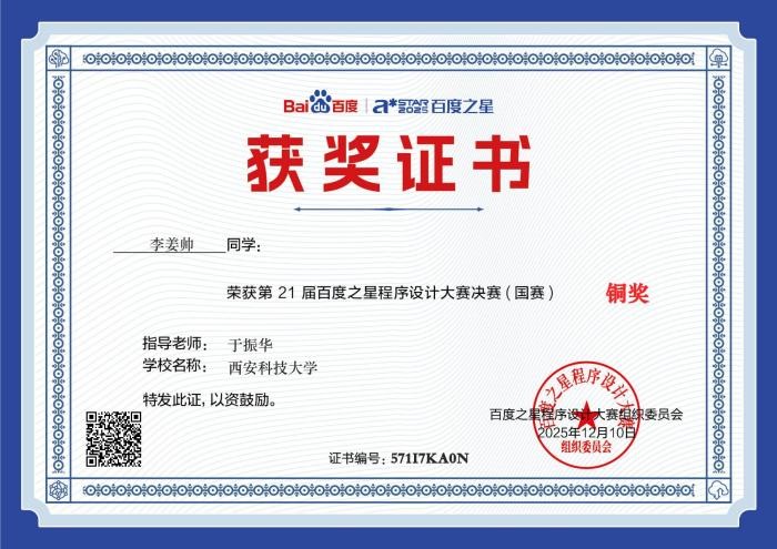 12月7日,由百度公司主办的第21届百度之星程序设计大赛决赛在北京落幕。​2026世界杯官网员工李姜帅凭借扎实的编程功底、出色的逻辑推理能力与稳定的临场发挥,在众多参赛选手的激烈角逐中脱颖而出,成功斩获铜奖,为公司赢得了该赛事历史上的首枚奖牌,彰显了公司在计算机领域个性化人才培养的显著成效。