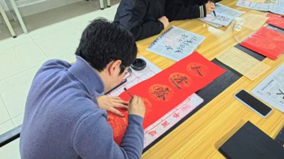 在写春联环节,大家挥毫泼墨,创作多幅融入党建元素和新春祝福的春联,现场气氛热烈。
