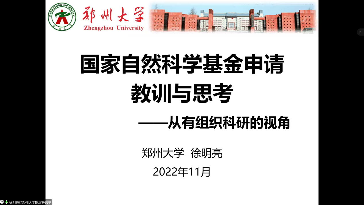 副经理马天首先根据公司要求和年度任务,对公司明年的国家自然科学基金申报工作做出安排,明确了各阶段的具体时间和要求,动员相关教师早做准备、做好准备,力争2023年取得佳绩。随后,徐明亮教授做了题为《国家自然科学基金申报的教训与思考》的辅导报告,从选题、行文、过程三个方面介绍了申报的经验和思考,强调写本子要边写边干,做科研要谋长线、积极融入学科大格局,努力向职业科学家转型。